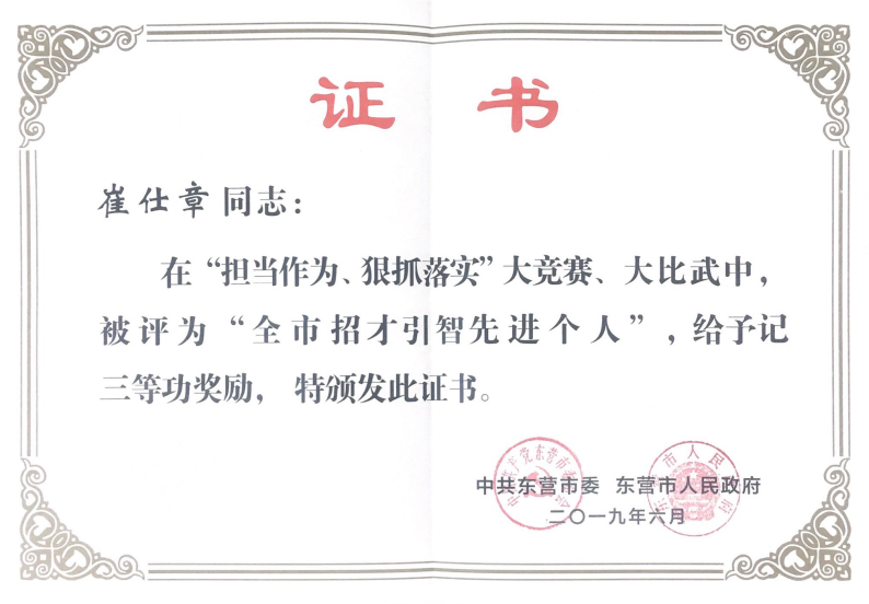 德仕集團(tuán)董事長(zhǎng)崔仕章榮獲“東營(yíng)市招才引智先進(jìn)個(gè)人”榮譽(yù)稱(chēng)號(hào)。